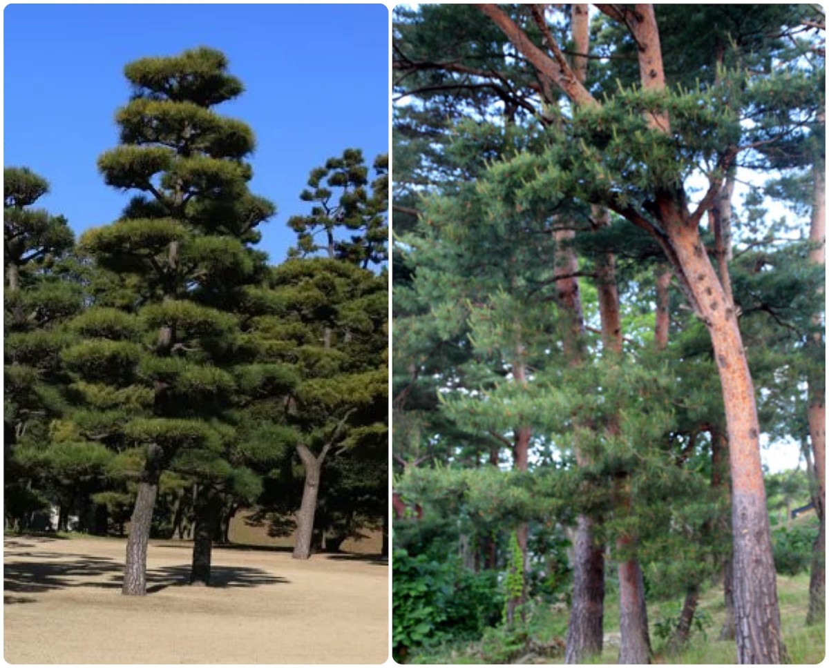 Pine trees are iconic in Japan, with the two most common types being the Japanese black pine kuro matsu 黒松 (Pinus thunbergii), left, and the Japanese red pine aka matsu 赤松 (Pinus densiflora), right.