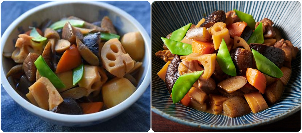 Chikuzen is the former name of a province, the area that is today part of Fukuoka Prefecture in Kyūshū. The word “ni” in the title of this dish refers to braising or stewing. Although the classic version of this dish is most often made with chicken, a vegan version with thick fried tōfu is also very popular.