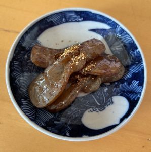 Indispensable in nabé (hot pot) cookery, as a condiment and in soups all parts of naga negi (Allium fistulosum) are edible. Plan from the start to use the plant fully, especially the higé (“whiskers”), to dry. Dusted in cornstarch and deep fried they become a savory, crunchy nibble or garnish for salads and soups (also nice added to grilled cheese sandwiches).